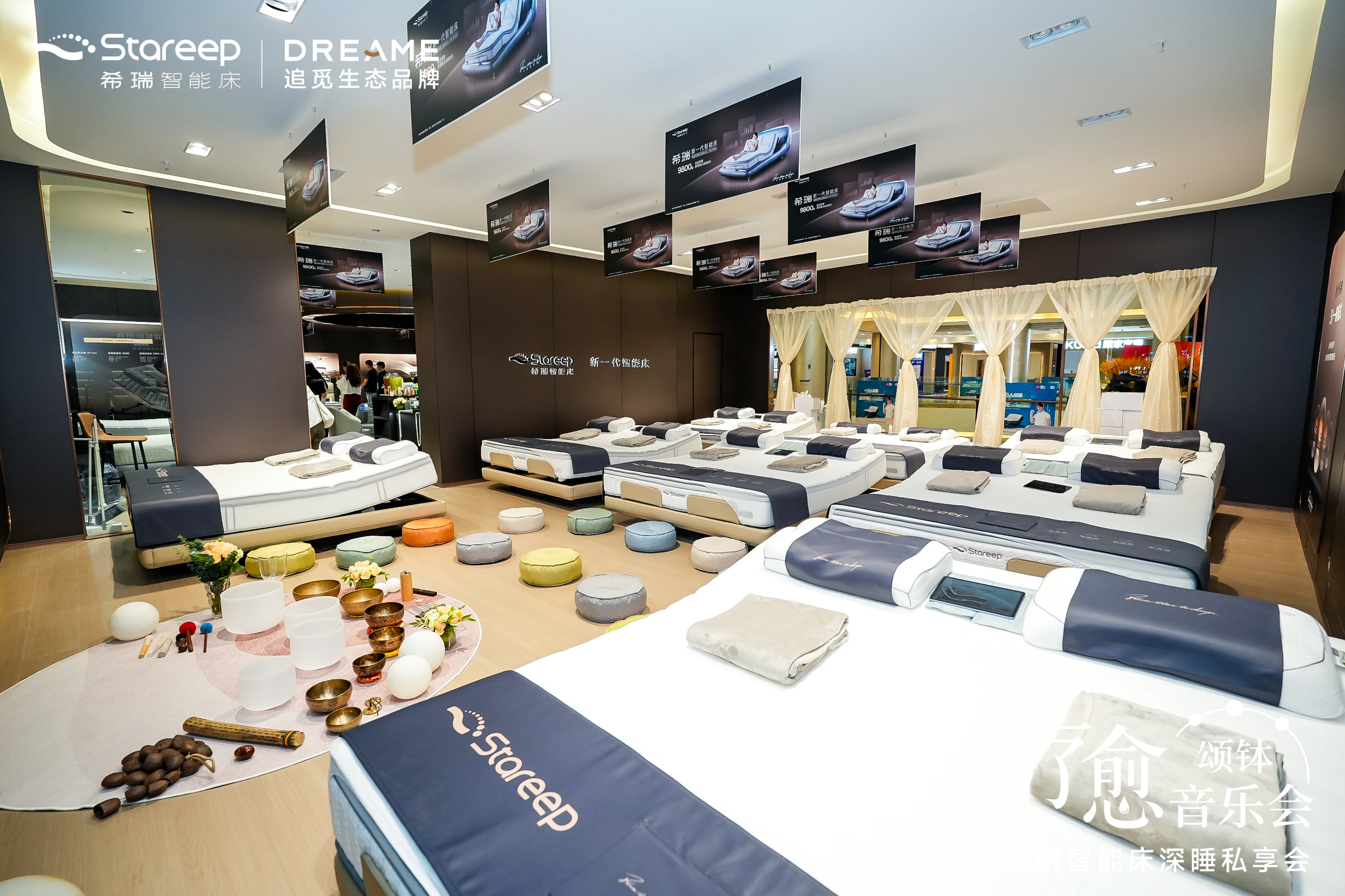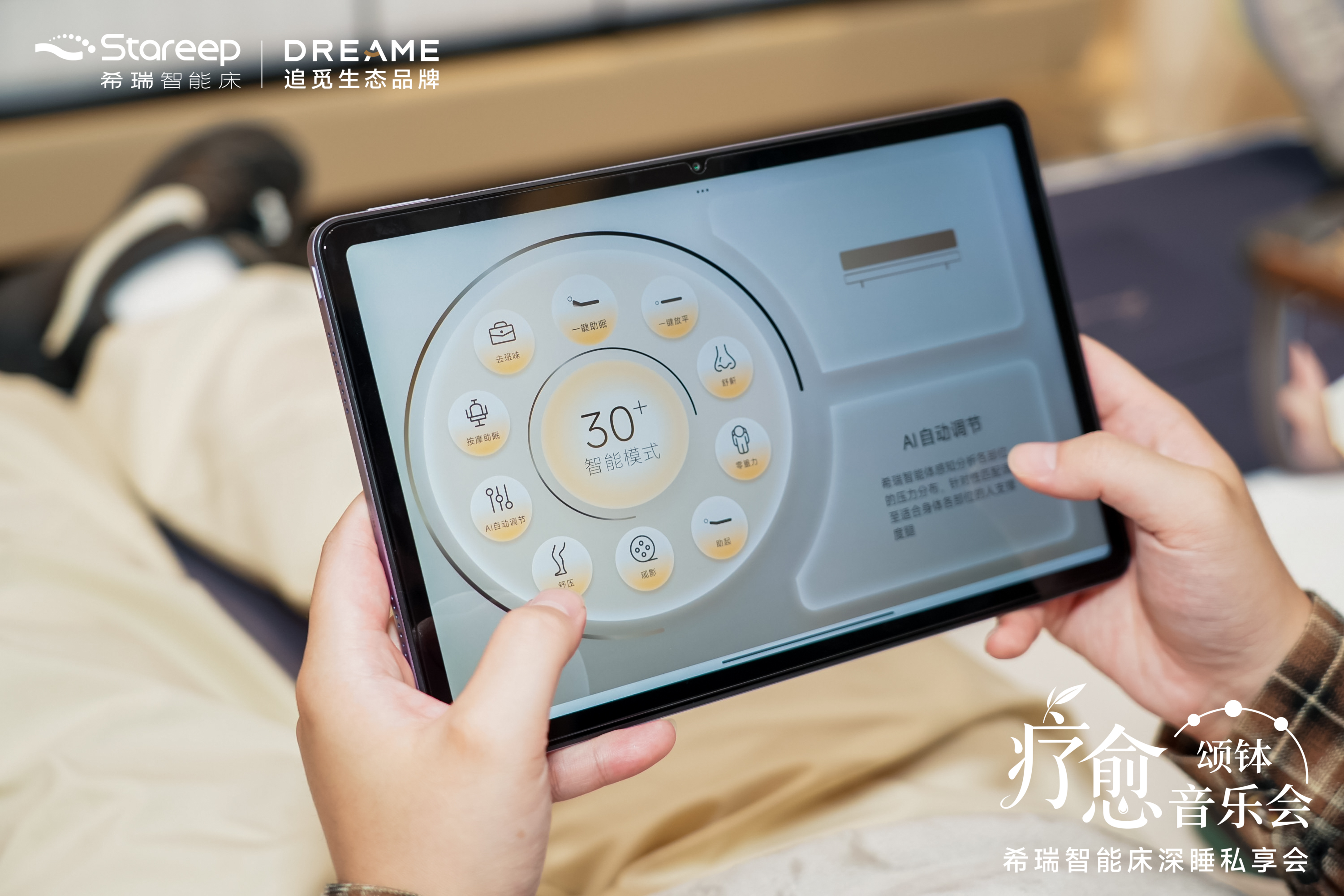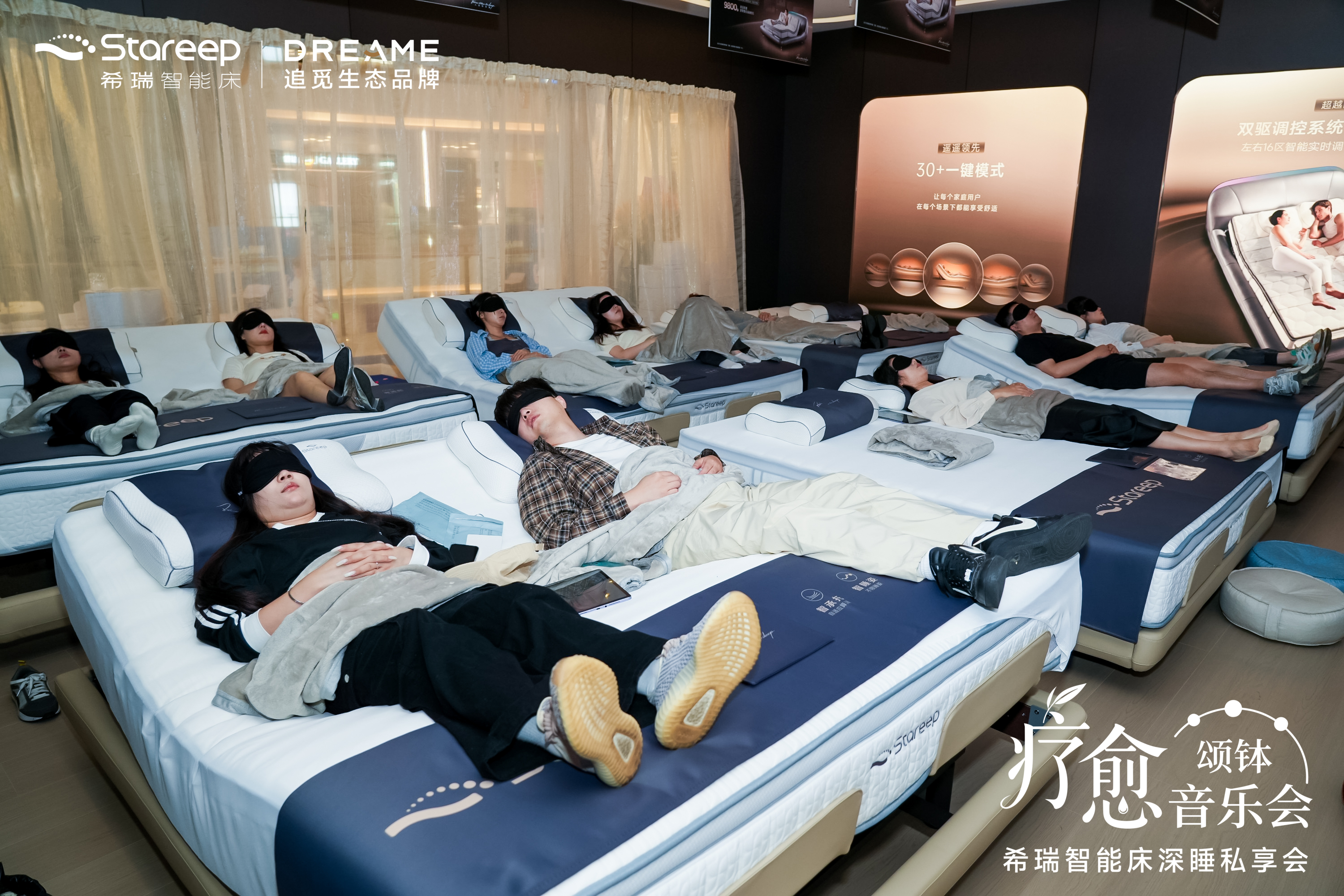 在活动中,音疗师以颂钵舒缓情绪,Stareep希瑞智能床则通过行业首创技术与AI自适应精准贴合舒展全身,让身体放松与情绪安定同频共振。科技与人文的融合,让“放松”真正可感可触。